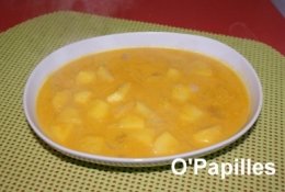 Il faut prévoir 1 bocal de soupe de potiron de 60cl, 4 pommes, 3 oignons, 1/2L de lait, 1 pincée de curry, 2 cuillères à soupe d'huile de tournesol.
