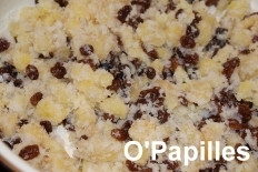 Ecraser grossièrement les pommes à la fourchette, ajouter le sucre vanillé, la noix de coco râpée et les raisins secs. Bien mélanger et étaler cette préparation dans un plat à tarte recouvert de papier sulfurisé. Recouvrir avec la pâte brisée et mettre au four (th6) durant 30mn.
