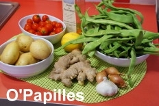 Il faut prévoir 600g de pommes de terre nouvelles Ditta, 1kg de haricots mange-tout, 200g de tomates cerises, 3 échalotes, 3 gousses d'ail, 1 citron, du gingembre frais, 1 cuillère à soupe d'huile de tournesol, sel et poivre.
