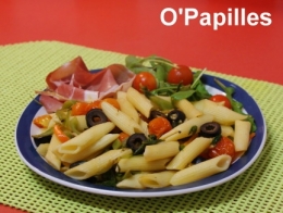 Il faut prévoir 250g de pennes, 2 poivrons verts, 16 tomates cerises, 2 gousses d'ail, 100g de roquette, du fromage râpé, 1 verre d'olives noires, 2 cuillères à soupe de tournesol, sel et poivre.