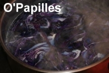 Débarrasser le chou rouge des premières feuilles, le couper en quatre et le passer sous l'eau. Bien l'égoutter. Faire bouillir une grande quantité d'eau salée. Pendant ce temps découper les choux en lanières fines en évitant les côtes trop grosses.